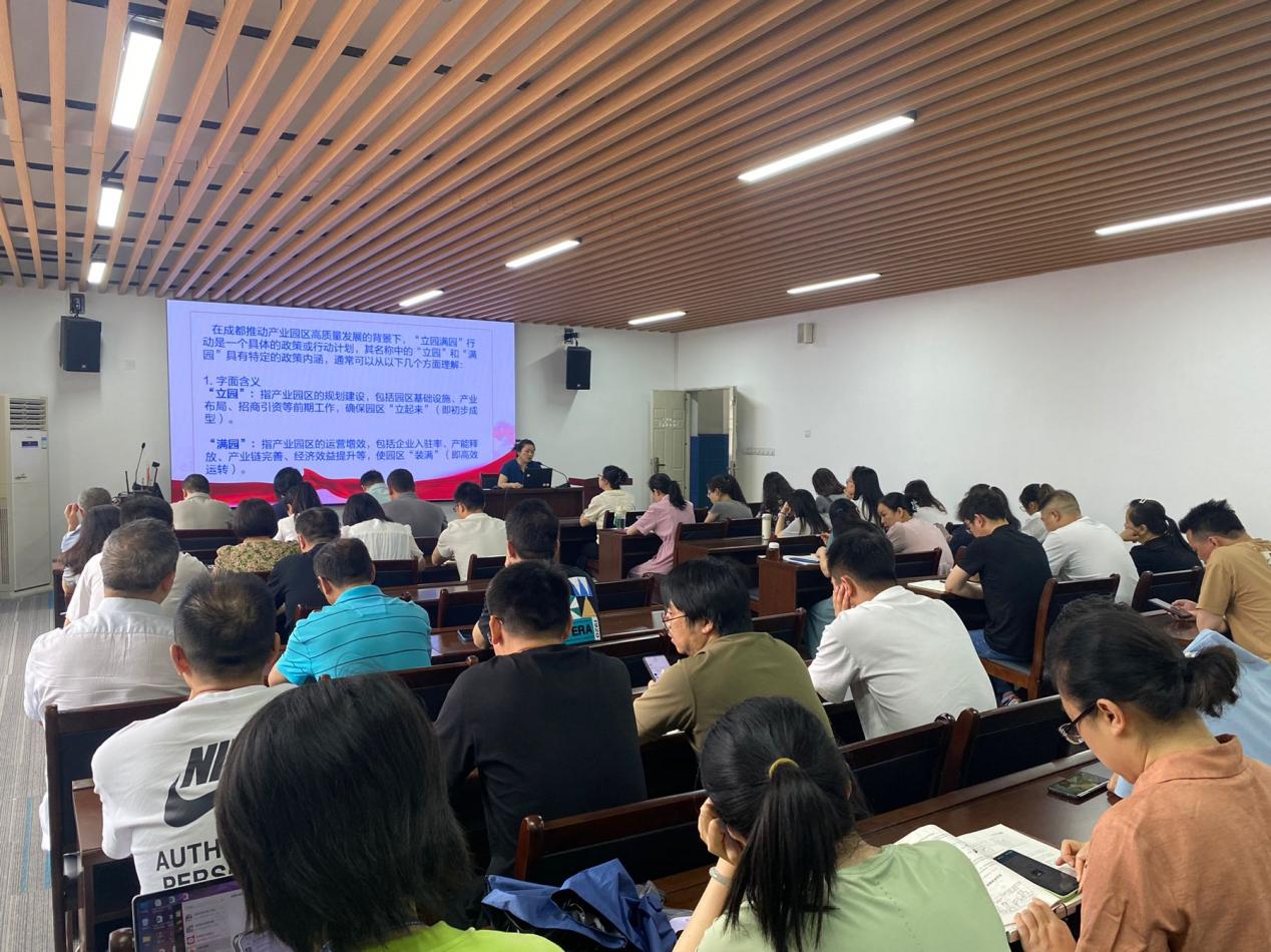 活动伊始,公司党总支副书记席盈对成都市“立园满园”行动展开了全面且深入的解读。她从政策出台的宏观背景出发,详细剖析了该行动产生的时代契机与政策导向;接着深入阐释了“立园满园”的丰富内涵与核心要义,指出“立园”阶段侧重于完善产业园区的基础设施建设与科学合理的产业布局规划,为园区发展筑牢根基;“满园”阶段则聚焦于提升园区的运营效率与经济效益,实现园区的可持续发展。席盈副书记还通过实际案例,生动展示了公司在产教融合、校企合作方面已取得的阶段性成果以及未来的发展规划,并鼓励全体教职工积极投身到“校、园、企、地”四位一体的融合发展建设中,充分发挥公司的人才和技术优势,为成都产业园区的高质量发展提供坚实的支撑。