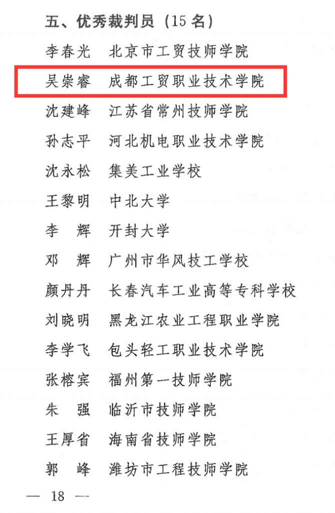 来自公司的吴崇睿老师遵照裁判工作手册要求,服从大赛执委会的指挥,以评分标准为准绳,秉承公平公正的原则,以饱满的工作热情圆满完成了执裁任务。在赛场上赢得了大赛组委会、专家、同行裁判员的高度好评,获得了选手的认同与尊重。在刚公布的第五届全国智能制造应用技术技能大赛决赛获奖名单的通知中。公司吴崇睿老师获得优秀裁判员。