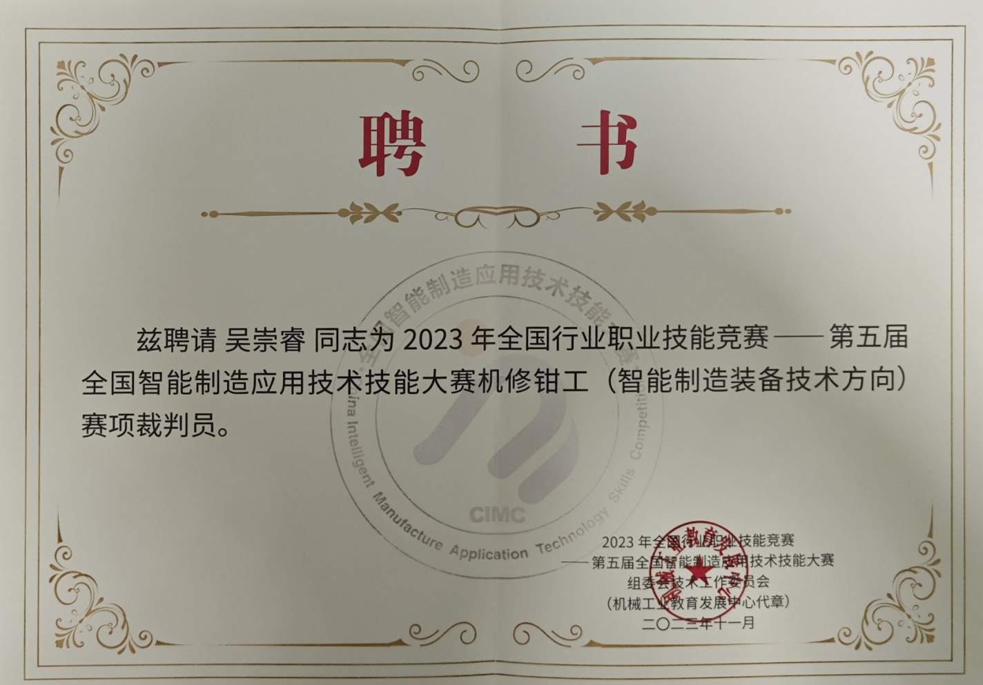 公司教师吴崇睿被聘为第五届全国智能制造应用技术技能大赛机修钳工(智能制造装备技术方向)裁判员。在这次大赛中,裁判工作需要较高的专业素养,丰富的考评工作经验,熟悉赛项涉及专业知识和操作技能。