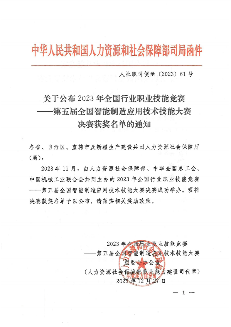 2023年11月,由人力资源社会保障部、中华全国总工会、中国机械工业联合会共同主办的2023年全国行业职业技能竞赛--第五届全国智能制造应用技术技能大赛决赛成功举办。